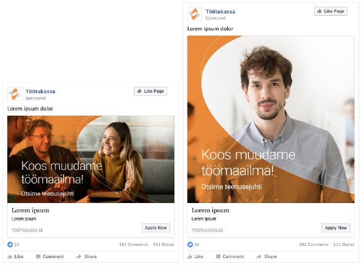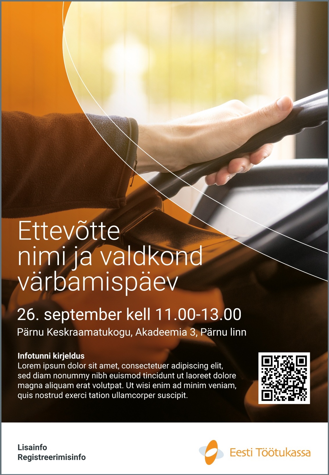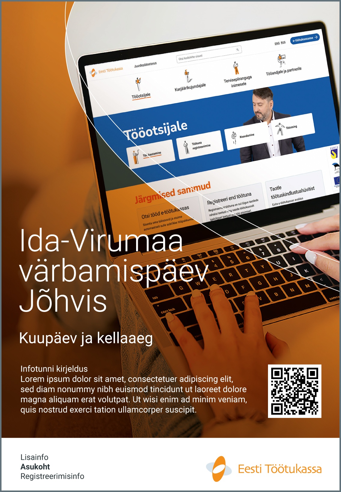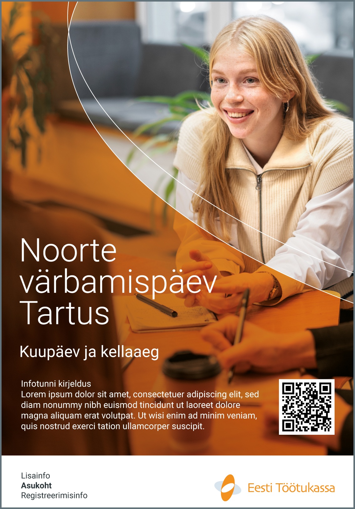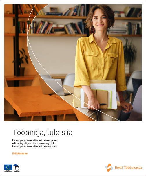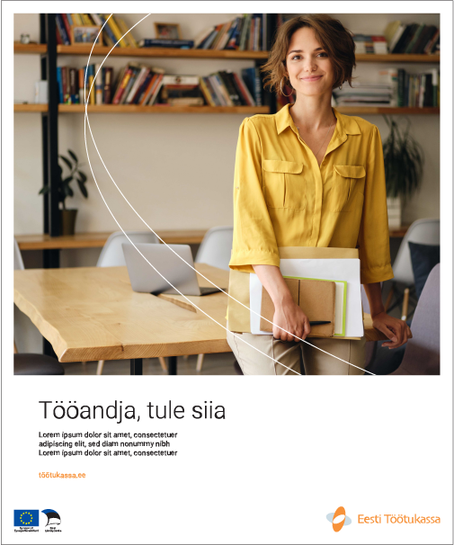 Reklaam pildi ja kaarega, kus kaarest välja jäävat osa katab läbipaistev oranž värv (töötukassa oranž multiply’ga)