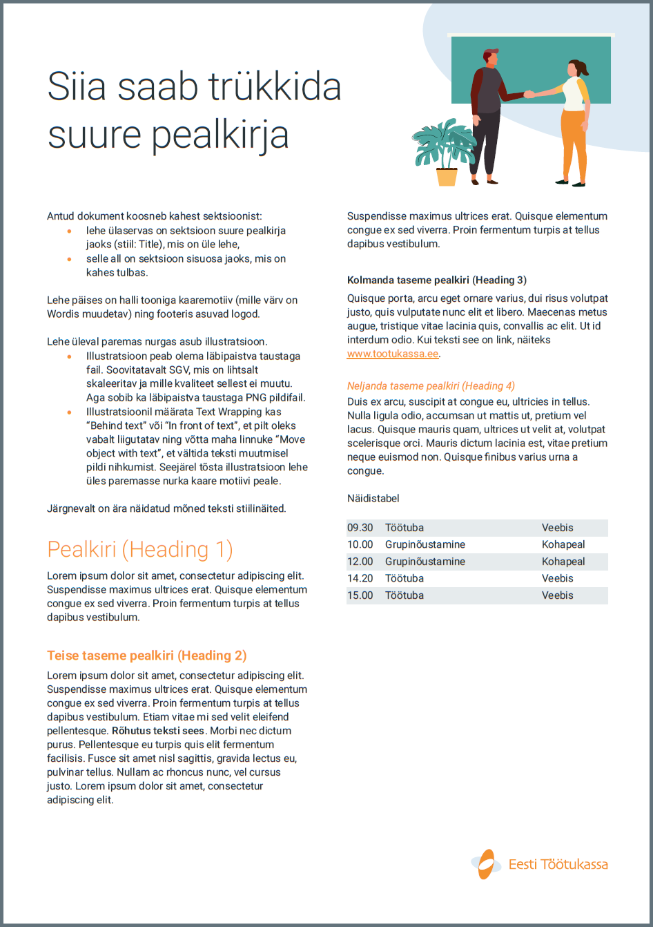Kõik illustratsioonid peavad olema töötukassa värvitoonides ning stiililt pehmed ja minimalistlikud.